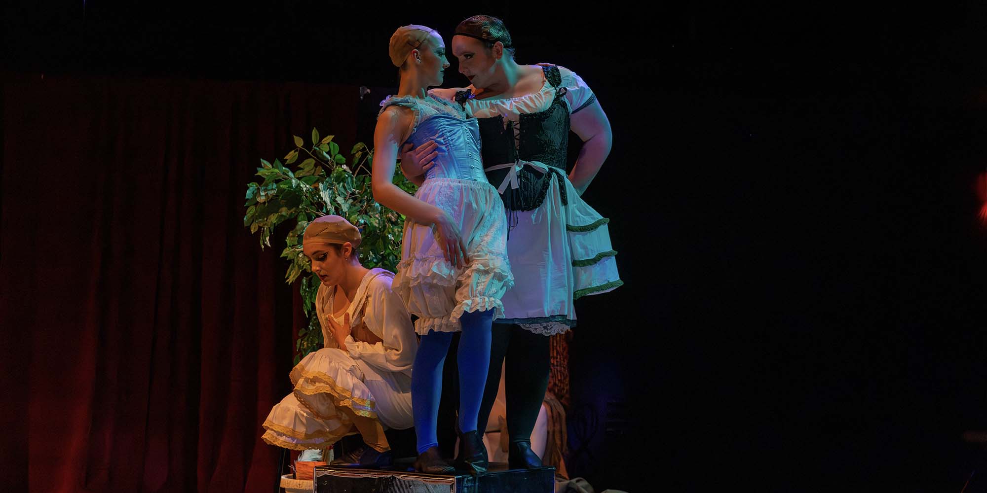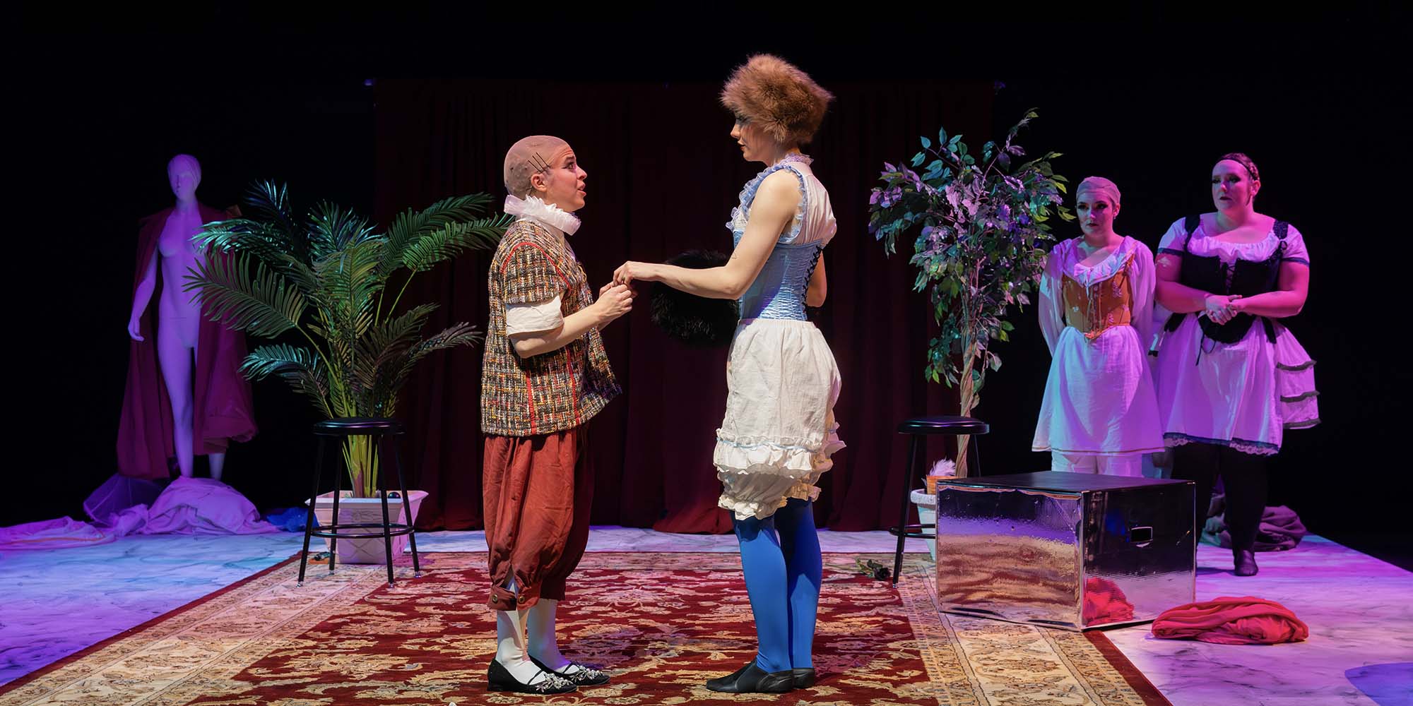 Audiences first encountered Orlando (played by RJ Fangmann ’27) in the court of Queen Elizabeth I and followed their extraordinary journey across centuries, culminating in a moment of revelation as Orlando completed a poem 500 years in the making, declaring, “I am about to understand…” A testament both to the liberatory power of the imagination and the elusive nature of identity, Ruhl retained much of Woolf’s evocative language while embracing the transformative power of the actor. Like any great adventure tale, Orlando’s journey was shaped by the myriad of characters with whom they interacted. In keeping with the fluid nature of Orlando, all characters were played by a small ensemble of performers (Jo Grejda ’26, MJ MaKinster ’28 and Grace Snook ’25, MAT’26) who engaged in ongoing shape shifting and adventure.