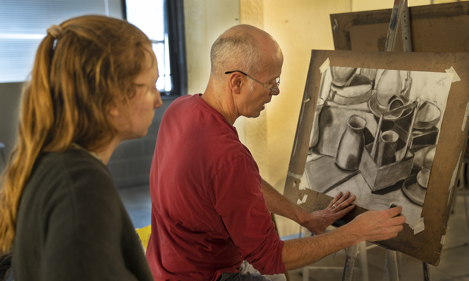 Katie Birzon 22 watches as Professor of Art and Architecture Nicholas Ruth demonstrates a technique for still life etchings during Introduction to Drawing in the Katherine D. Elliott Studio Arts Center.- Carly Pruitt '20, Darby Johnson '19 and Richie Andes '19 work with Professor of Geoscience Neil Laird in the Barron Multimedia Lab at the Warren Hunting Smith Library.