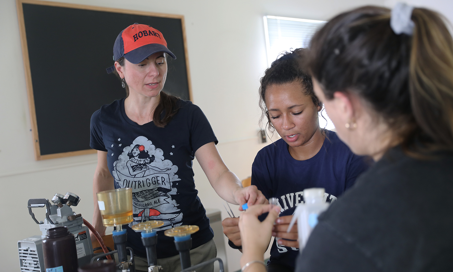 - Meg Quint '21 chats with Assistant Professor of Chemistry Elana Stennett in Rosenberg Hall. Quint and Stennett are researching the relationship between fluorescently-labeled proteins and the biofouling of membranes during desalination.