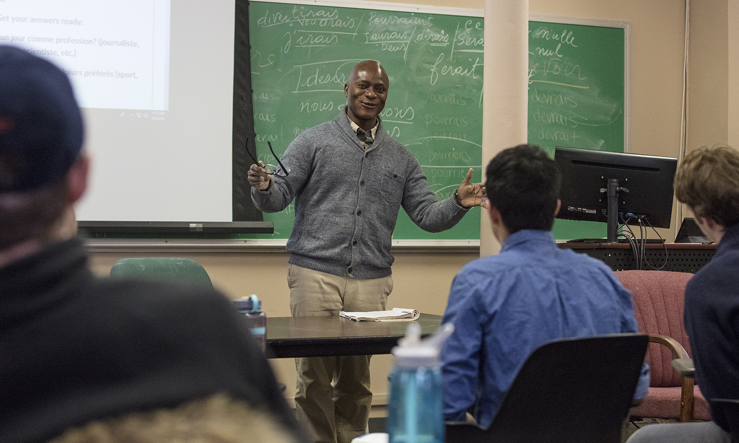 - Associate Professor of French and Francophone Studies Kanate Dahouda reviews vocabulary during Intermediate French II in Demarest Hall.