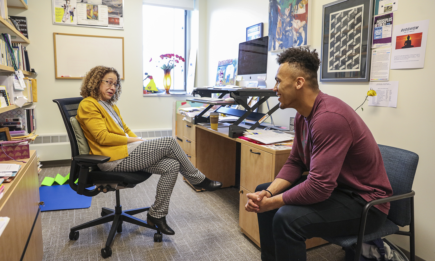 - Dante Kimbrough '22 meets with his adviser, Professor of Dance Donna Davenport, in Davenport's office in the Gearan Center for the Performing Arts.