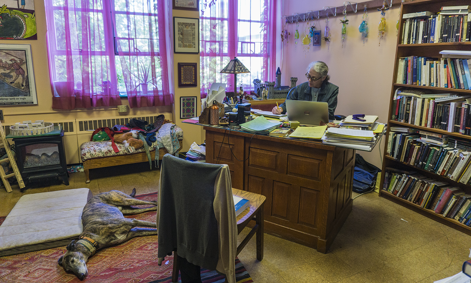 - Associate Professor of English Laurence Erussard grades exams after the end of the semester while her dog Houdin rests on the rug in her office.