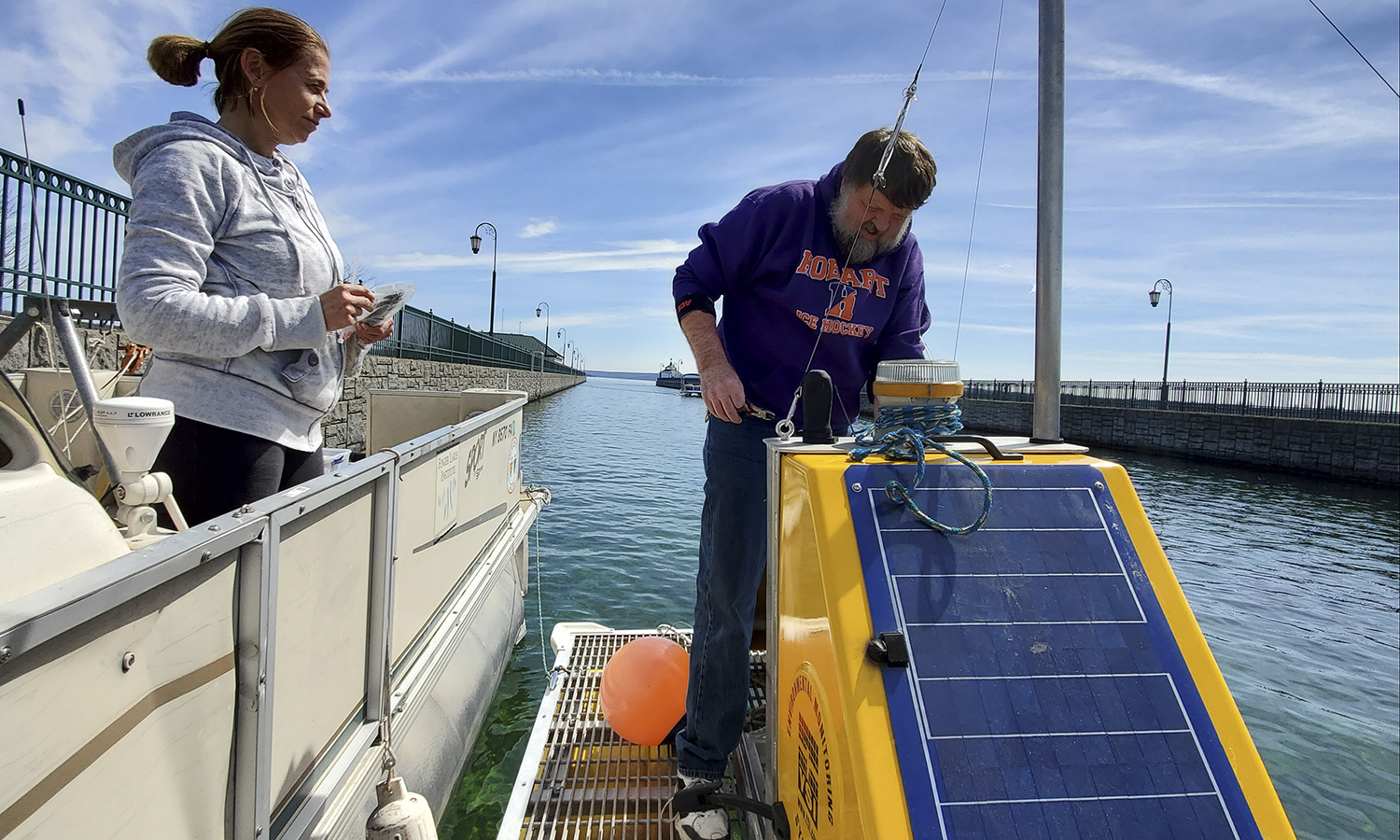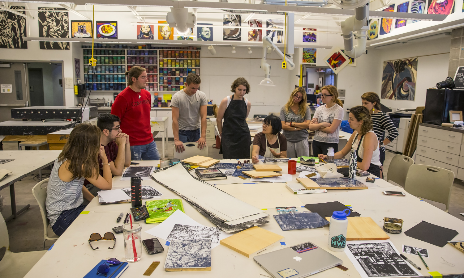 Associate Professor of Physics Ileana Dumitriu (left) and Professor of Environmental Studies John Halfman deploy a buoy on Owasco Lake. Part of a Finger Lakes Institute research project, the buoy monitors fluctuations in environmental conditions and water quality. This data supplements data acquired from weekly sampling on the lake regarding nutrient levels, algal and toxin concentrations and water chemistry.- Professor of Art and Architecture Phillia Yi speaks to students during Woodcut Printing in the Katherine D. Elliott '66 Studio Arts Center.