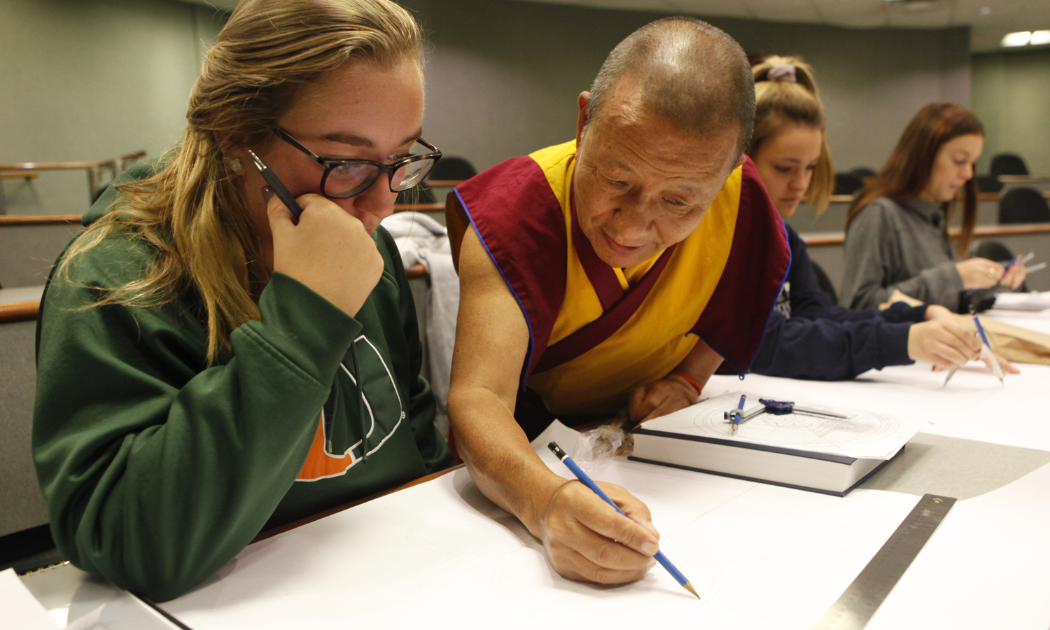 Associate Professor of Biology Meghan Brown assists Amelia Smith '21 and Maddie Ferguson '21 with lab work as part of Aquatic Biology at the Hanley Nature Preserve.- Brice Winder 20 gets a helping hand from the The Venerable Tenzin Yignyen during Tibetan Mandala Painting, in the Sanford Room in Warren Hunting Smith Library.