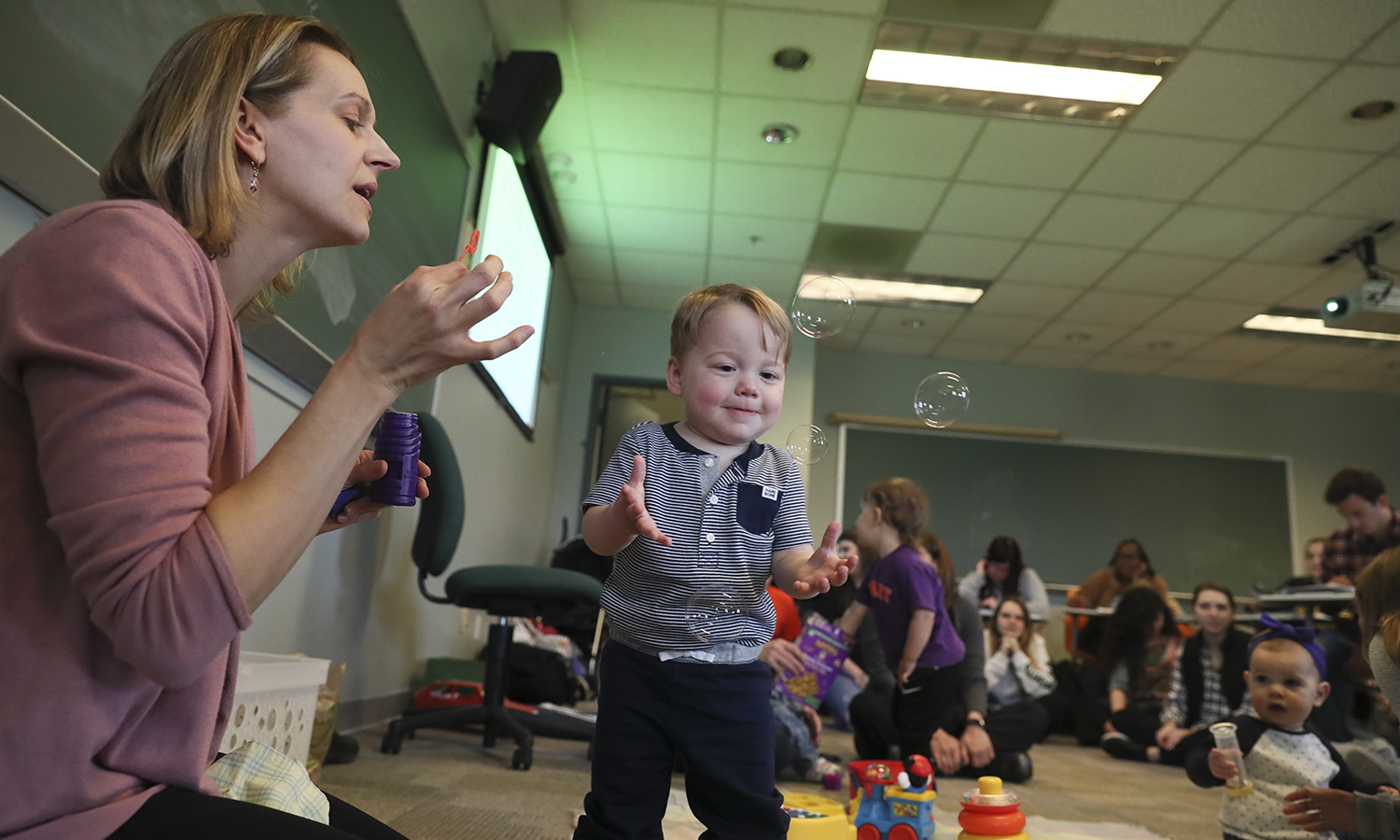 Associate Professor of Psychology Julie Newman Kingery conducts a Developmental Detectives activity, where students are asked to guess the age of visiting children after observing their motor and language skills.
