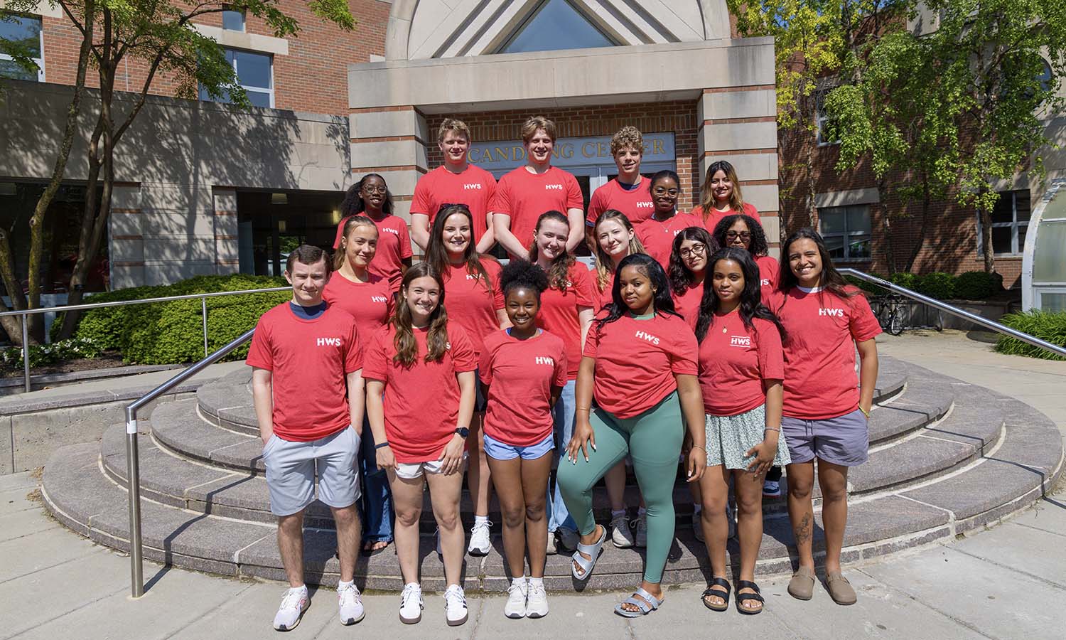 Reunion ambassadors or “Red Shirts” pose for a photo on the steps of the Scandling Campus Center.